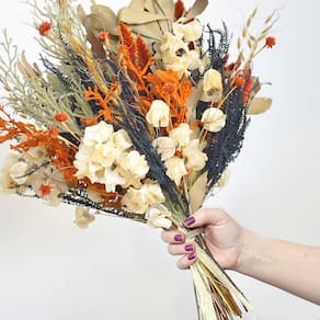 Todos os nossos arranjos e buquês são criados com flores naturais desidratadas artesanalmente. Por ser um processo manual, isso garante que cada arranjo seja único em sua composição.