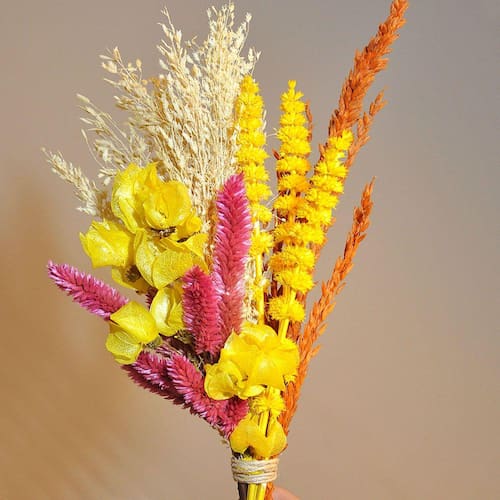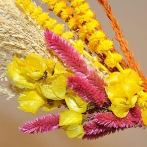 Todos os nossos arranjos e buquês são criados com flores naturais desidratadas artesanalmente. Por ser um processo manual, isso garante que cada arranjo seja único em sua composição.