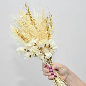 Todos os nossos arranjos e buquês são criados com flores naturais desidratadas artesanalmente. Por ser um processo manual, isso garante que cada arranjo seja único em sua composição.