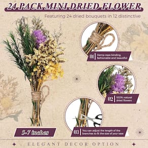 Características: Artesanato sincero: Estes mini buquê de flores são preparados usando apenas as flores e plantas secas naturais. Eles não têm odores e coisas desagradáveis, são seguros e confiáveis de usar. Pacote completo: Cada pacote inclui 24 mini pacotes de flores secas. Estes pacotes de flores secas prontos para usar oferecem uma maneira fácil de elevar a decoração da sua casa ou eventos comemorativos enquanto economiza tempo e esforço. Especificações: Material: flores e plantas Cor: como mostrado na imagem. Tamanho: como mostrado na imagem. A embalagem inclui: 24 x mini pacote de flores secas Observações: Medição manual, permita pequenos erros no tamanho. A cor pode existir uma ligeira diferença devido a diferentes ecrãs. Pode haver risco de engolir, por favor, fique longe de crianças pequenas. - Coleção abundante e versátil: você receberá 24 buquês secos que são bonitos e enérgicos em e estilos; Esta quantidade abundante garante que haja muito para o seu uso diário, substituições e aplicações decorativas variadas; Esta coleção combina com os gostos de diferentes pessoas, tornando seu casamento boêmio ou projeto de decoração de casa mais alegre e refrescante; Nota: você pode usar um secador de cabelo por cerca de 5 minutos para obter uma flor completa - Natural e Estética: cada flor seca no pacote é feita à mão a partir de flores e plantas secas naturais, resultando em cada buquê sendo ligeiramente requintado em sua maneira; Com nossos produtos, você pode desfrutar do apelo estético de flores e plantas orgânicas e inodoras com confiança - Variedade e tamanho diversos: nossos mini buquês de flores secas apresentam quase 20 tipos de flores e folhas secas, como junco, aveia, anis, grama do amor, hortênsia, flor feliz, cártamo, painço e muito mais; Cada mini buquê mede aproximadamente 12,7 a 17,8 cm, adequado para decorações de pequenos espaços; apesar de seu peso leve e tamanho pequeno, esses buquês incorporam a beleza da natureza - Opção de presente ideal: envie palavras sinceras com nossos pequenos feixes de flores secas como presente; seja um aniversário, aniversário ou outro feriado, esses feixes de flores são uma escolha ideal para expressar seus sentimentos; O ato de presentear esses lindos buquês certamente aproximará você e o destinatário - Dicas de uso e cuidados versáteis: estes buquês secos são ideais para casamentos boêmios, decoração de casa, projetos de bricolage e muito mais; Como são flores secas naturais com desenhos feitos à mão, uma pequena variação de tamanho e cor da imagem exibida é normal, mas tenha certeza, seu apelo estético geral permanece constante