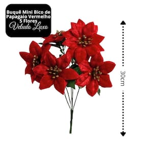 Transforme sua decoração de Natal com o charme clássico do Buquê Natalino Mini Bico de Papagaio em Veludo Vermelho. Com 5 flores em tecido de veludo com acabamento aveludado e rico em detalhes, este buquê oferece elegância e sofisticação para composições natalinas.