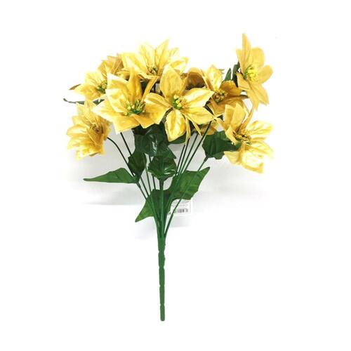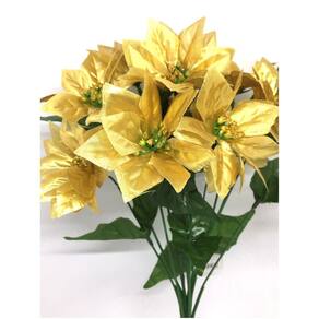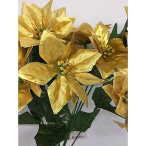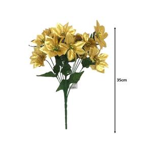 Buque de folhagem artificial e flor bico de papagaio de Natal na cor dourada, o bouquet artificial apresenta 12 galhos e 12 flores Bico de Papagaio Dourado decor Gliter.