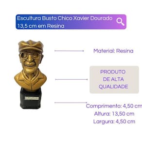 Busto Chico Xavier ou Bezerra Menezes em Resina- Escolha Seu Cor: Chico Xavier Dourado 13cm Busto Chico Xavier ou Bezerra Menezes em Resina- Escolha Seu O Busto Chico Xavier ou Bezerra Menezes em Resina da Bialluz é uma escultura com muito valor espiritual, e possui muita fé envolvida. Tem detalhes minuciosos e uma pintura maravilhosa que ressalta toda a escultura. Por ser confeccionada em resina tem alta qualidade e resistência. Carregada de fé e paz, trará ótimas energias para sua vida e dará muita luz no seu caminho Escolha um dos modelos disponíveis na opção COR do próprio anúncio. Enviamos a sua escultura em até 24 horas após a confirmação de pagamento Material: Resina Cor: Dourado Por ser uma peça feita artesanalmente e pintada à mão podem ocorrer pequenas variações nas cores ou tamanhos. Caso tenha alguma dúvida nos mande mensagem que respondemos rapidinho para te ajudar da melhor forma possível Marca: Bialluz