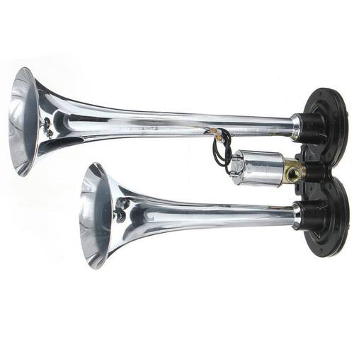 Com 2 cornetas cromadas imponentes em metal, essa Buzina Automotiva Eletropneumática Flat é universal para veículos de 12V, proporcionando um alerta sonoro impactante de 118dB com frequência aguda em 450Hz.