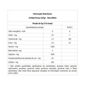 C4 Beta Pump 225g - Sabor: Açaí com Guaraná C4 Beta Pump 225g O C4 Beta Pump é um pré-treino altamente concentrado e que prepara seu organismo para um trabalho intenso e desgastante. A suplementação de beta-alanina é efetiva no aumento da concentração de carnosina no músculo, aumentando pH e retardando a fadiga. Além disso possui a Vitamina B6, que auxilia no funcionamento do seu organismo. Altamente concentrado, O C4 Beta Pump prepara o organismo do atleta para um trabalho intenso de desgaste. Ele apresenta, em sua fórmula, cafeína e outras substâncias com grande poder e energético, o que o torna o pré-treino mais poderoso do mercado. Além disso, O C4 Beta Pump foi escolhido na categoria nacional como melhor pré-treino do mercado, dessa forma ganhando o Prêmio Suplementação 2018. A New Millen foi escolhida, com o C4 Beta Pump, como a melhor opção do mercado nacional na categoria pré-treino pela terceira vez. O Prêmio Suplementação 2018 contou com 11 categorias, que foram decididas pelo voto popular e apresentadas na feira Brasil Trading Fitness Fair, em . benefícios: - Suplemento Pré-Treino em Pó;- Mais Energia e Disposição;- Fórmula Extra Pump Ação Vasodilatadora ;- 200mg de Cafeína por Porção;- Zero Glúten;- Aumenta o volume muscular.