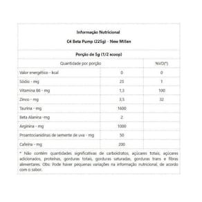 C4 Beta Pump 225g - Sabor: Maçã Verde. C4 Beta Pump 225g O C4 Beta Pump é um pré-treino altamente concentrado e que prepara seu organismo para um trabalho intenso e desgastante. A suplementação de beta-alanina é efetiva no aumento da concentração de carnosina no músculo, aumentando pH e retardando a fadiga. Além disso possui a Vitamina B6, que auxilia no funcionamento do seu organismo. Altamente concentrado, O C4 Beta Pump prepara o organismo do atleta para um trabalho intenso de desgaste. Ele apresenta, em sua fórmula, cafeína e outras substâncias com grande poder e energético, o que o torna o pré-treino mais poderoso do mercado. Além disso, O C4 Beta Pump foi escolhido na categoria nacional como melhor pré-treino do mercado, dessa forma ganhando o Prêmio Suplementação 2018. A New Millen foi escolhida, com o C4 Beta Pump, como a melhor opção do mercado nacional na categoria pré-treino pela terceira vez. O Prêmio Suplementação 2018 contou com 11 categorias, que foram decididas pelo voto popular e apresentadas na feira Brasil Trading Fitness Fair, em . benefícios: - Suplemento Pré-Treino em Pó;- Mais Energia e Disposição;- Fórmula Extra Pump Ação Vasodilatadora ;- 200mg de Cafeína por Porção;- Zero Glúten;- Aumenta o volume muscular.