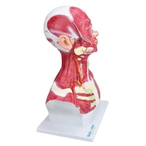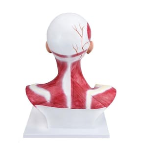 Modelo anatômico de cabeça e pescoço com musculatura superficial, confeccionado em resina plástica e com pintura feita à mão e cores realísticas.