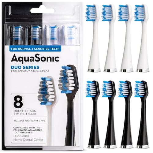 Pacote com 8 cabeças de escova de substituição – Projetado pela DuPont; líder mundial em ciência de materiais - Cabeças de escova de substituição: Compatível com as seguintes alças de escova de dentes: Duo Series & Home Dental Center. Não é compatível com Duo Series Pro. Obtenha o melhor desempenho da sua escova de dentes AquaSonic escolhendo cabeças de escova de substituição AquaSonic autênticas. Estas cabeças de escova projetadas pela DuPont apresentam cerdas de comprimento variável para atingir áreas difíceis de alcançar entre os dentes e ao longo da linha da gengiva. - Alta qualidade: feitas de materiais de alta qualidade, nossas cabeças de escova apresentam cerdas suaves nos dentes e gengivas, mas eficazes na remoção de placa bacteriana e tártaro. Eles também são fáceis de substituir, tornando simples garantir que você obtenha o melhor desempenho de limpeza da sua escova de dentes AquaSonic. - Recomendações: Substituir a cabeça da escova é fácil e leva apenas alguns segundos, garantindo que sua escova de dentes AquaSonic permaneça em ótimas condições. Troque a cabeça da escova a cada 3 meses para um desempenho ideal de escovação. Troque a cabeça da escova antes se desgastar. Certifique-se de enxaguar bem as cerdas após cada uso. - MARCA REPUTÁVEL DOS EUA: AquaSonic é uma marca de higiene bucal sediada nos EUA confiável pelos clientes por fornecer escovas de dentes e irrigadores bucais de alto desempenho. Nossos produtos refletem um profundo compromisso com a qualidade, inovação e satisfação do cliente. - O que vem na caixa: 8 cabeças de escova de substituição (4 pretas, 4 brancas)