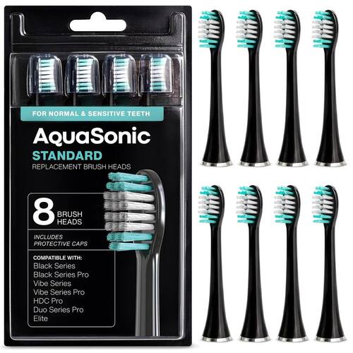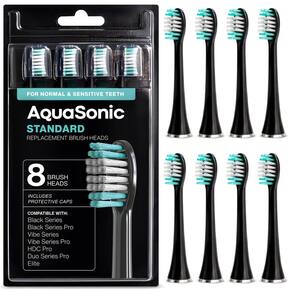 Pacote com 8 cabeças de escova de substituição – Projetado pela DuPont; líder mundial em ciência dos materiais - Cabeças de escova de substituição: Compatível com as seguintes alças de escova de dentes: Black Series, Black Series Pro, Vibe Series, HDC Pro, Duo Series Pro e Elite. Obtenha o melhor desempenho da sua escova de dentes AquaSonic escolhendo cabeças de escova de substituição AquaSonic autênticas. Estas cabeças de escova padrão projetadas pela DuPont são curvadas para contornar a superfície do dente, enquanto as cerdas cônicas limpam efetivamente entre os dentes e ao longo da linha da gengiva. - QUALIDADE SUPERIOR: Feitas de materiais de alta qualidade, nossas cabeças de escova apresentam cerdas que são suaves para os dentes e gengivas, mas eficazes na remoção de placa bacteriana e tártaro. Eles também são fáceis de substituir, tornando simples garantir que você obtenha o melhor desempenho de limpeza da sua escova de dentes AquaSonic. - RECOMENDAÇÕES: Substituir a cabeça da escova é fácil e leva apenas alguns segundos, garantindo que sua escova de dentes AquaSonic permaneça na melhor condição. Troque a cabeça da escova a cada 3 meses para um desempenho de escovação ideal. Troque a cabeça do pincel mais cedo se ela ficar desgastada. Certifique-se de enxaguar bem as cerdas após cada uso. - Marca confiável: AquaSonic é uma empresa sediada nos EUA reconhecida como líder confiável em tecnologia de higiene bucal. De nossas escovas de dentes elétricas aos nossos irrigadores bucais, nossos produtos conquistaram dezenas de milhares de clientes satisfeitos elogiando nossa qualidade e dedicação ao atendimento ao cliente. - O que vem na caixa: 8 cabeças de escova de substituição padrão em preto.