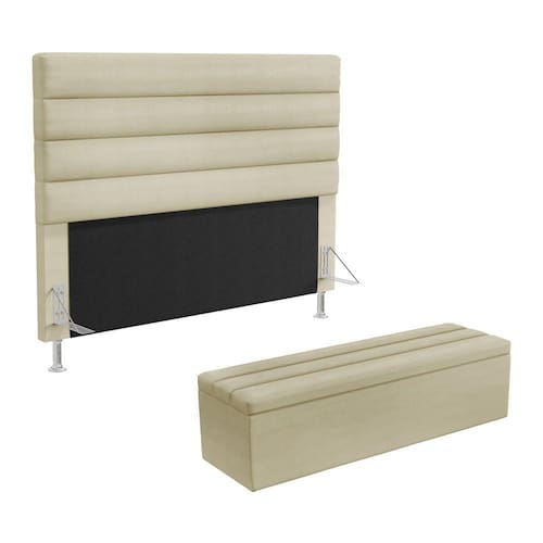 O Kit Cabeceira Atlas foi inspirada para você, ela possui um design clássico, perfeita para seu espaço, possui também detalhes modernos na horizontal e um ótimo acabamento, tudo isso com ótimo custo benefício. Possui dois pés de 12 cm e fixação via frames para a sustentação do box, não sendo necessário furar a sua cama, apenas encaixa-la nos suportes da cabeceira. Junto com a Calçadeira Ursa que possui uma ótima capacidade de armazenamento interno, podendo armazenar cobertores, almofadas, entre outros. Adquira já! Dimensões da CabeceiraLargura: 140 cmAltura: 127 cmProfundidade: 10 cmPeso: 15 KgDimensões da CalçadeiraLargura: 140 cmAltura: 45 cmProfundidade: 46 cmPeso: 15 KgDimensões do Produto embaladoVolume 1Largura: 142 cmAltura: 129 cmProfundidade: 12 cmPeso: 17 kgVolume 2Largura: 142 cmAltura: 47 cmProfundidade: 48 cmPeso: 17 kgCaracterísticas do Produto:Madeira de eucalipto proveniente de reflorestamentoFixação com grampos galvanizadosEspuma Poliuretano D20Revestimento: SuedCor: BegeTamanho: Casal Padrão para cama box de 138 cmPossui pés: SimTipo de pés: 2 pés PVC de 12 cm e 4 sapatasEmbalagem: plástico bolha, papelão ondulado, malha, plásticoFixação diretamente no box através de framesGarantia de 3 meses contra defeitos de fábrica.Diferenciais: - Madeira de alta qualidade- Design moderno- Material resistente- Ótimo acabamento- Estrutura reforçadaSistema de Montagem: O produto é enviado montado, sendo necessário apenas a fixação dos frames e pés.Manual de Montagem: SimVolume: 2 VolumesMontagem: Recomendamos que seja feita por um profissionalRecomendação de Limpeza: Utilize pano levemente úmidoObservações importantes- Produto para uso residencial em ambiente interno, não devendo ficar exposto diretamente ao sol, calor e umidades excessivas.- Pode haver alguma diferença de tonalidade entre a imagem e o produto real, por conta do tratamento de imagens e a calibração de cores do seu monitor.- As imagens são meramente ilustrativas, não acompanham objetos de decoração e eletrônicos.