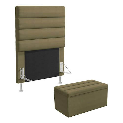O Kit Cabeceira Atlas foi inspirada para você, ela possui um design clássico, perfeita para seu espaço, possui também detalhes modernos na horizontal e um ótimo acabamento, tudo isso com ótimo custo benefício. Possui dois pés de 12 cm e fixação via frames para a sustentação do box, não sendo necessário furar a sua cama, apenas encaixa-la nos suportes da cabeceira. Junto com a Calçadeira Ursa que possui uma ótima capacidade de armazenamento interno, podendo armazenar cobertores, almofadas, entre outros. Adquira já! Dimensões da CabeceiraLargura: 90 cmAltura: 127 cmProfundidade: 10 cmPeso: 10 KgDimensões da CalçadeiraLargura: 92 cmAltura: 45 cmProfundidade: 46 cmPeso: 10 KgDimensões do Produto embaladoVolume 1Largura: 92 cmAltura: 129 cmProfundidade: 12 cmPeso: 12 kgVolume 2Largura: 92 cmAltura: 47 cmProfundidade: 48 cmPeso: 12 kgCaracterísticas do Produto:Madeira de eucalipto proveniente de reflorestamentoFixação com grampos galvanizadosEspuma Poliuretano D20Revestimento: VeludoCor: CapuccinoTamanho: Solteiro para cama box de 88 cmPossui pés: SimTipo de pés: 2 pés PVC de 12 cm e 4 sapatasEmbalagem: plástico bolha, papelão ondulado, malha, plásticoFixação diretamente no box através de framesGarantia de 3 meses contra defeitos de fábrica.Diferenciais: - Madeira de alta qualidade- Design moderno- Material resistente- Ótimo acabamento- Estrutura reforçadaSistema de Montagem: O produto é enviado montado, sendo necessário apenas a fixação dos frames e pés.Manual de Montagem: SimVolume: 2 VolumesMontagem: Recomendamos que seja feita por um profissionalRecomendação de Limpeza: Utilize pano levemente úmidoObservações importantes- Produto para uso residencial em ambiente interno, não devendo ficar exposto diretamente ao sol, calor e umidades excessivas.- Pode haver alguma diferença de tonalidade entre a imagem e o produto real, por conta do tratamento de imagens e a calibração de cores do seu monitor.- As imagens são meramente ilustrativas, não acompanham objetos de decoração e eletrônicos.