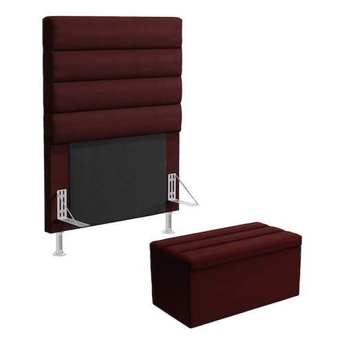 O Kit Cabeceira Atlas foi inspirada para você, ela possui um design clássico, perfeita para seu espaço, possui também detalhes modernos na horizontal e um ótimo acabamento, tudo isso com ótimo custo benefício. Possui dois pés de 12 cm e fixação via frames para a sustentação do box, não sendo necessário furar a sua cama, apenas encaixa-la nos suportes da cabeceira. Junto com a Calçadeira Ursa que possui uma ótima capacidade de armazenamento interno, podendo armazenar cobertores, almofadas, entre outros. Adquira já! Dimensões da CabeceiraLargura: 90 cmAltura: 127 cmProfundidade: 10 cmPeso: 10 KgDimensões da CalçadeiraLargura: 92 cmAltura: 45 cmProfundidade: 46 cmPeso: 10 KgDimensões do Produto embaladoVolume 1Largura: 92 cmAltura: 129 cmProfundidade: 12 cmPeso: 12 kgVolume 2Largura: 92 cmAltura: 47 cmProfundidade: 48 cmPeso: 12 kgCaracterísticas do Produto:Madeira de eucalipto proveniente de reflorestamentoFixação com grampos galvanizadosEspuma Poliuretano D20Revestimento: SuedCor: BordôTamanho: Solteiro para cama box de 88 cmPossui pés: SimTipo de pés: 2 pés PVC de 12 cm e 4 sapatasEmbalagem: plástico bolha, papelão ondulado, malha, plásticoFixação diretamente no box através de framesGarantia de 3 meses contra defeitos de fábrica.Diferenciais: - Madeira de alta qualidade- Design moderno- Material resistente- Ótimo acabamento- Estrutura reforçadaSistema de Montagem: O produto é enviado montado, sendo necessário apenas a fixação dos frames e pés.Manual de Montagem: SimVolume: 2 VolumesMontagem: Recomendamos que seja feita por um profissionalRecomendação de Limpeza: Utilize pano levemente úmidoObservações importantes- Produto para uso residencial em ambiente interno, não devendo ficar exposto diretamente ao sol, calor e umidades excessivas.- Pode haver alguma diferença de tonalidade entre a imagem e o produto real, por conta do tratamento de imagens e a calibração de cores do seu monitor.- As imagens são meramente ilustrativas, não acompanham objetos de decoração e eletrônicos.