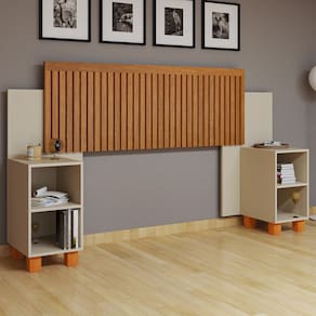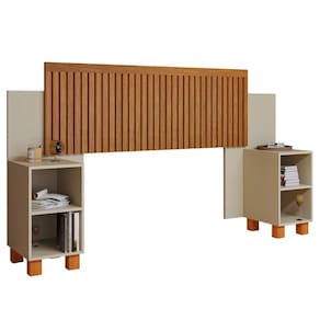 Com design ripado e pés de madeira em cor natural, ela acompanha 2 mesas de cabeceira com nichos, perfeitas para organizar livros, objetos decorativos, luminárias e itens de uso diário.