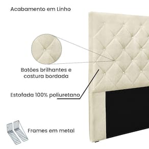 Dormir bem e manter-se seguro na hora de relaxar são fatores importantes que influenciam na qualidade do sono. Unir esses pontos com uma decoração incrível seria perfeito, não é mesmo? Que tal começar essa mudança pela cabeceira da sua cama!? A Cabeceira Tania sem dúvida vai roubar a cena de tão linda e aconchegante! A estrutura é feita em madeira de eucalipto, uma opção que ressalta a durabilidade e beleza da peça. A cabeceira é preenchida com espuma D23, garantindo um conforto ideal para noites mais tranquilas. Este modelo é indicado para Cama Box Casal de 140 cm, contém costura bordada em losangos com botões brilhantes que conferem uma textura maleável e um visual refinado. O revestimento foi feito no Linho, um tecido de alta qualidade no tom Pérola perfeita para criar uma atmosfera mais aconchegante ao local. As sapata são de plástico além de serem muito resistentes garantem maior flexibilidade e sustentação à peça. E não menos importante acompanha frame em metal que é o suporte ideal para fixar a cabeceira na cama box. O design desta peça apresenta um elemento estético sofisticado, que transformará instantaneamente o ambiente e impedirá que a passagem de temperaturas (frio/quente) que se concentram na parede, passem diretamente para o usuário. A Cabeceira Tania é a opção mais adequada para o seu dormitório, afinal de contas você merece o que há de melhor para completar a decoração da sua casa. Adquira a Cabeceira Tania antes que acabe o estoque!