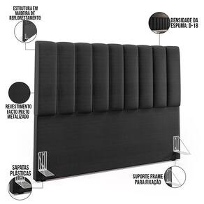 Cabeceira Cama Box Casal Queen 160 Cm Dália W01 Facto Preto Metalizado - Lyam Decor Com bastante graciosidade a Cabeceira Cama Box Casal Queen 160 Cm Dália W01 Facto Preto Metalizado - Lyam Decor traz conforto e modernidade ao seu quarto. Com ela é possível montar várias combinações diferentes, as possibilidades são infinitas visto que ela conversa super bem com o restante da mobília e traz harmonia ao ambiente. Produzida com materiais de máxima qualidade garante aconchego e tranquilidade para seus momentos de descanso, seja para o quarto do casal ou de hospedes. Aproveite!! Dimensões da Cabeceira (L x A x P) 160 x 120 x 8 cm Dimensões do Frame (L x A x P) 5,5 x 13,5 x 16,5 cm Características da Cabeceira: Estrutura em madeira . Revestimento em tecido sintético Facto Preto, acabamento metalizado. Densidade da Espuma D-18. Acompanha todos os acessórios para fixação. Acompanha suporte frame produzido em chapa de ferro com acabamento em esmalte PU na cor alumínio. Possui sapatas plásticas. Características do Frame: Produzido em chapa de ferro 1,5 mm. Acabamento em esmalte PU na cor Alumínio. Acessórios para fixação: 04 Parafs cabeça chata auto atarraxantes 5,0x25mm e 04 arruelas 1/4. - Por se tratar de estofado as medidas podem ter uma pequena variação de até 3 cm. - A tonalidade do produto real poderá ter ligeira variação devido o lote de tecidos. Observações importantes: - Produto para residencial em ambiente interno, não devendo ficar exposto diretamente ao sol, calor e umidade excessivos. - Pode haver alguma diferença de tonalidade entre a imagem e o produto real, por conta do tratamento de imagens e a calibração de cores do seu monitor. - As imagens são meramente ilustrativas, não acompanham objetos de decoração e eletrônicos. - Ao receber a mercadoria, o cliente deve verificar as condições da embalagem, caso haja alguma não assine o comprovante de recebimento. - Montagem, desmontagem e outras instalações serão de responsabilidade do cliente. Não nos responsabilizamos, no ato da , por subir escadas/elevadores ou pelo transporte por guincho em apartamentos. Eventuais despesas são de responsabilidade do comprador. - Confira as dimensões do produto e certifique-se de que passará normalmente por supostos elevadores, portas, escadas e/ou corredores de sua residência. NA
