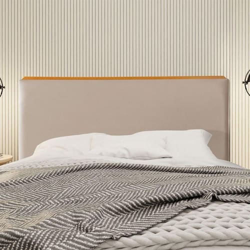 AS IMAGENS SÃO MERAMENTE ILUSTRATIVAS E PODEM SOFRER VARIAÇÕES DE COR E PEQUENOS DETALHES DE ACORDO COM O SEU MONITOR, ILUMINAÇÃO DO AMBIENTE E ATÉ MESMO A SUA PERCEPÇÃO VISUAL.Cabeceira Cama Box King 1,93m Estofada Detalhe em Madeira Java Veludo Bege