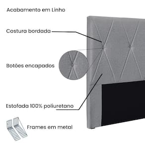 Dormir bem e manter-se seguro na hora de relaxar são fatores importantes que influenciam na qualidade do sono. Unir esses pontos com uma decoração incrível seria perfeito, não é mesmo? Que tal começar essa mudança pela cabeceira da sua cama!? A Cabeceira Aquilla sem dúvida vai roubar a cena de tão linda e aconchegante! A estrutura é feita em madeira de eucalipto, uma opção que ressalta a durabilidade e beleza da peça. A cabeceira é preenchida com espuma D23, garantindo um conforto ideal para noites mais tranquilas. Este modelo é indicado para Cama Box King de 195 cm, contém costura em losangos com botões encapados que conferem uma textura maleável e um visual refinado. O revestimento foi feito no Linho, um tecido de alta qualidade perfeito para criar uma atmosfera mais aconchegante ao local. As sapata são de plástico além de serem muito resistentes garantem maior flexibilidade e sustentação à peça. E não menos importante acompanha frame em metal que é o suporte ideal para fixar a cabeceira na cama box. O design desta peça apresenta um elemento estético sofisticado, que transformará instantaneamente o ambiente e impedirá que a passagem de temperaturas (frio/quente) que se concentram na parede, passem diretamente para o usuário. A Cabeceira Aquilla é a opção mais adequada para o seu dormitório, afinal de contas você merece o que há de melhor para completar a decoração da sua casa. Adquira a Cabeceira Aquilla antes que acabe o estoque! Dimensões da Cabeceira: Altura total: 125 cm Largura total: 195 cm Profundidade total: 8 cm Peso: 13 kg Especificações do Produto Estrutura: Madeira De Eucalipto Espuma: D-23 Tecido: Linho Tipo de pés: Sapatas Plasticas Garantia: 90 dias contra defeito de fabricação Montagem: Produto vai montado. Instruções de limpeza: Utilizar um pano limpo e levemente úmido Você irá receber: 01 Cabeceira Entregue em: 01 Volume