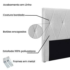Dormir bem e manter-se seguro na hora de relaxar são fatores importantes que influenciam na qualidade do sono. Unir esses pontos com uma decoração incrível seria perfeito, não é mesmo? Que tal começar essa mudança pela cabeceira da sua cama!? A Cabeceira Aquilla sem dúvida vai roubar a cena de tão linda e aconchegante! A estrutura é feita em madeira de eucalipto, uma opção que ressalta a durabilidade e beleza da peça. A cabeceira é preenchida com espuma D23, garantindo um conforto ideal para noites mais tranquilas. Este modelo é indicado para Cama Box King de 195 cm, contém costura em losangos com botões encapados que conferem uma textura maleável e um visual refinado. O revestimento foi feito no Linho, um tecido de alta qualidade perfeito para criar uma atmosfera mais aconchegante ao local. As sapata são de plástico além de serem muito resistentes garantem maior flexibilidade e sustentação à peça. E não menos importante acompanha frame em metal que é o suporte ideal para fixar a cabeceira na cama box. O design desta peça apresenta um elemento estético sofisticado, que transformará instantaneamente o ambiente e impedirá que a passagem de temperaturas (frio/quente) que se concentram na parede, passem diretamente para o usuário. A Cabeceira Aquilla é a opção mais adequada para o seu dormitório, afinal de contas você merece o que há de melhor para completar a decoração da sua casa. Adquira a Cabeceira Aquilla antes que acabe o estoque!