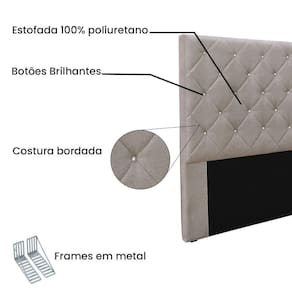 Dormir bem e manter-se seguro na hora de relaxar são fatores importantes que influenciam na qualidade do sono. Unir esses pontos com uma decoração incrível seria perfeito, não é mesmo? Que tal começar essa mudança pela cabeceira da sua cama!? A Cabeceira Tania sem dúvida vai roubar a cena de tão linda e aconchegante! A estrutura é feita em madeira de eucalipto, uma opção que ressalta a durabilidade e beleza da peça. A cabeceira é preenchida com espuma D23, garantindo um conforto ideal para noites mais tranquilas. Este modelo é indicado para Cama Box King de 195 cm, contém costura bordada em losangos com botões brilhantes que conferem uma textura maleável e um visual refinado. O revestimento foi feito no Linho, um tecido de alta qualidade perfeito para criar uma atmosfera mais aconchegante ao local. As sapata são de plástico além de serem muito resistentes garantem maior flexibilidade e sustentação à peça. E não menos importante acompanha frame em metal que é o suporte ideal para fixar a cabeceira na cama box. O design desta peça apresenta um elemento estético sofisticado, que transformará instantaneamente o ambiente e impedirá que a passagem de temperaturas (frio/quente) que se concentram na parede, passem diretamente para o usuário. A Cabeceira Tania é a opção mais adequada para o seu dormitório, afinal de contas você merece o que há de melhor para completar a decoração da sua casa. Adquira a Cabeceira Tania antes que acabe o estoque!