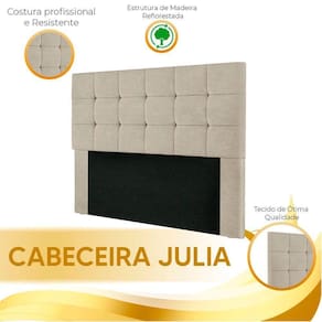 A cabeceira Julia possui um lindo design que te ajuda a renovar a decoracao do seu quarto, sem deixar de lado o conforto e a praticidade. Resistente e confeccionada com materiais de alta qualidade, suas medidas sao indicadas para cama box de 1.58 cm. Combine-a com travesseiros e almofadas de sua preferencia e torne sua decoracao ainda mais charmosa e aconchegante.