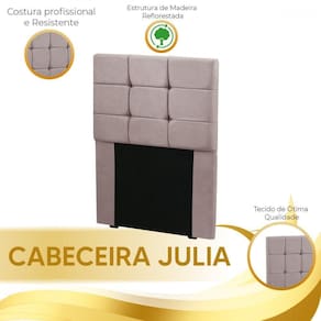 A cabeceira Julia possui um lindo design que te ajuda a renovar a decoracao do seu quarto, sem deixar de lado o conforto e a praticidade. Resistente e confeccionada com materiais de alta qualidade, suas medidas sao indicadas para cama box de 0.88 cm. Combine-a com travesseiros e almofadas de sua preferencia e torne sua decoracao ainda mais charmosa e aconchegante.