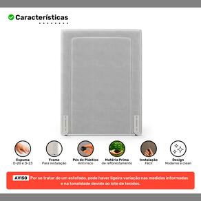 Fabricada com estrutura em madeira de eucalipto de reflorestamento e espumas D-20 e D-23, proporciona conforto, resistência e excelente custo-benefício. Conta com sapatas plásticas e acompanha frame adaptador para fácil fixação diretamente no box, dispensando o uso de furadeira ou fixações na parede.