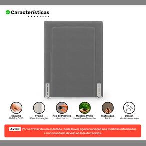 Fabricada com estrutura em madeira de eucalipto de reflorestamento e espumas D-20 e D-23, proporciona conforto, resistência e excelente custo-benefício. Conta com sapatas plásticas e acompanha frame adaptador para fácil fixação diretamente no box, dispensando o uso de furadeira ou fixações na parede.