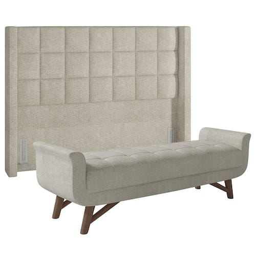 A Cabeceira Casal tem um design moderno, com detalhes quadrados que dão um toque de sofisticação ao quarto. A estrutura é feita de eucalipto, uma madeira resistente e sustentável, e a espuma é D20, garantindo uma boa noite de sono. O conjunto vem com um frame que facilita a instalação da cama. A Calçadeira é uma peça versátil, que pode ser usada tanto no quarto quanto na Sala de Estar, como um banco ou um apoio para os pés. Ele tem um detalhe capitonê no assento, que cria um efeito acolchoado e charmoso. Os pés são de madeira, combinando, e a espuma é D23, oferecendo mais firmeza e durabilidade. Ambos os produtos são revestidos em bouclé, um tecido macio e aconchegante, que está em alta na decoração. Você vai se surpreender com a beleza, o conforto e a qualidade desses produtos.