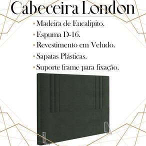 Cabeceira Casal 138 cm London Veludo, ideal para inovar o seu quarto com toque luxuoso e ao mesmo tempo refinado. Estrutura em madeira de eucalipto, que oferece maior durabilidade ao produto. Composta por revestimento em tecido veludo, conta com espuma D-16 de altíssima qualidade, sapatas plásticas e acompanha frames para facilitar a fixação no box, é ideal para colchão Casal de 138 cm. Unindo elementos do design contemporâneo, que proporcionam uma ambientação moderna e com acabamentos sofisticados. Este móvel chegará na sua casa separado em 01 volume.