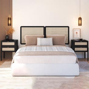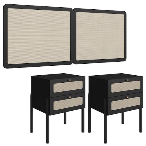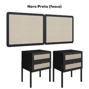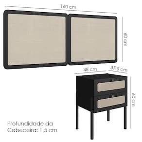 Cabeceira e 2 Mesas de Cabeceira 27978, o conjunto ideal para deixar seu quarto mais elegante. Produzido em madeira maciça Eucalipto e MDP 15 mm com acabamento BP. As mesas contam com gavetas com corrediças metálicas, puxadores em poliestireno dourado e detalhes em tela sintética (PVC) imitando palhinha, também presentes na cabeceira. Possui ainda sapatas emborrachadas que evitam atrito com o piso. Atende aos padrões Casal e Queen Size. Produto entregue em 5 volumes.