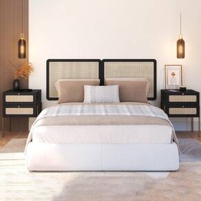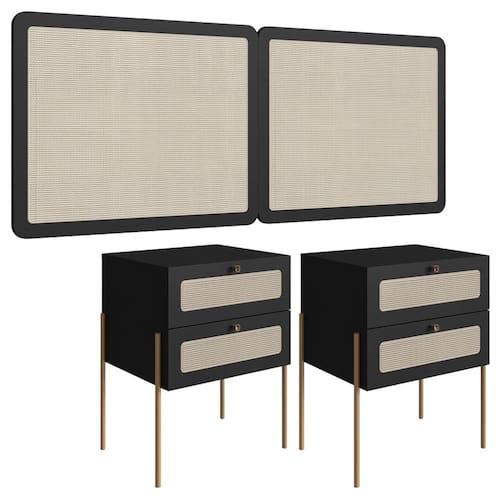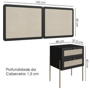 Cabeceira e 2 Mesas de Cabeceira 28978, o conjunto ideal para deixar seu quarto mais elegante. Produzido em tubo metálico em aço com pintura epóxi dourada e MDP 15 mm com acabamento BP. As mesas possuem gavetas com corrediças metálicas, puxadores em poliestireno dourado e detalhes em tela sintética (PVC) imitando palhinha, também presentes na cabeceira. Conta ainda com ponteiras plásticas que evitam atrito com o piso. Atende aos padrões Casal e Queen Size. Produto entregue em 5 volumes.