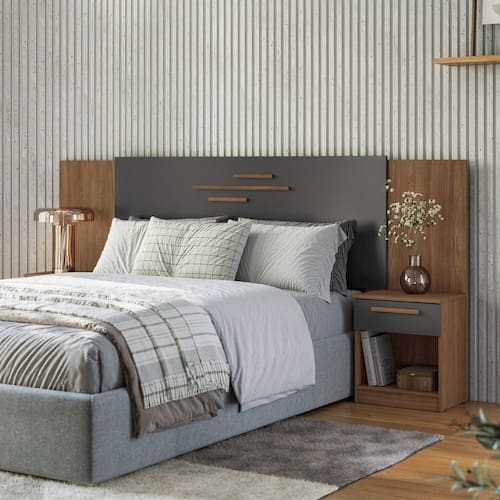 Esta cabeceira é um móvel de fácil montagem, além de ser muito prática e bonita. Esta cabeceira possui 02 gavetas, uma de cada lado, que deslizam sobre corrediças telescópicas, onde é possível apoiar: pequenos objetos, livros, celulares, e a decoração que você quiser expor. Sua estrutura em 12cm e 15cm está projetada para ser utilizada com colchões box de casal nas medidas 1,38cm à 1,58cm de largura, pois essa cabeceira possui um sistema de montagem que se ajusta às duas medidas de colchões. (dupla furação) Detalhes ripados na cabeceira, combinando com os puxadores em MDF revestidos, dão um charme todo especial a este modelo de cabeceira. O acabamento deste móvel é em verniz fosco, tudo dentro dos padrões de preservação ao meio ambiente, seguindo as normas de sustentabilidade. Produto Montado: Sim Acabamento da Mesa de Cabeceira: Verniz Ambiente Principal: Quarto Cabeceira Estofada: Não codigo_ean: 7900288097538 Complexidade da Montagem: Média: pode ser montado por mais de uma pessoa e/ou necessite de maior conhecimento para montagem Cor: Jatobá/ Grafitte Cor do Produto: Jatobá/ Grafitte Escala de Brilho: Fosco Escala de Brilho da Mesa de Cabeceira: Fosco Extensível: Sim Fixação Box: Não Fixação na Parede: Não Itens Inclusos: 1 Cabeceira, +1 Kit Ferragem, +1 Manual em PDF Largura Máxima: 256 cm Largura Mínima: 236,8 cm Linha ou Coleção: Linha Paraná Manual de Montagem e Instalação: https://product-hub-prd.madeiramadeira.com.br/982396/documents/6a98e86c-ea99-4270-90f1-3f4e2d281ffc86951742587504982396150906.pdf Marca: Santos Andirá Material da Mesa de Cabeceira: MDP Material Principal: MDP Necessita Montagem: Sim Origem do Produto: Nacional Peso: 37,95 kg Possui Baú: Não Possui Espelho: Não Possui Mesa de Cabeceira: 02 Possui Pés: Não Possui Vidro: Não Recomendações de Uso, Manutenção e Limpeza: Durabilidade: Permite ser desmontado e montado até cinco vezes. 5 – Manutenção: Não limpar com álcool ou qualquer outro produto químico, utilize somente pano seco ou levemente umedecido. Sistema de Montagem: Parafusos, Cavilha, Minifix Tipo de Colchão: Casal