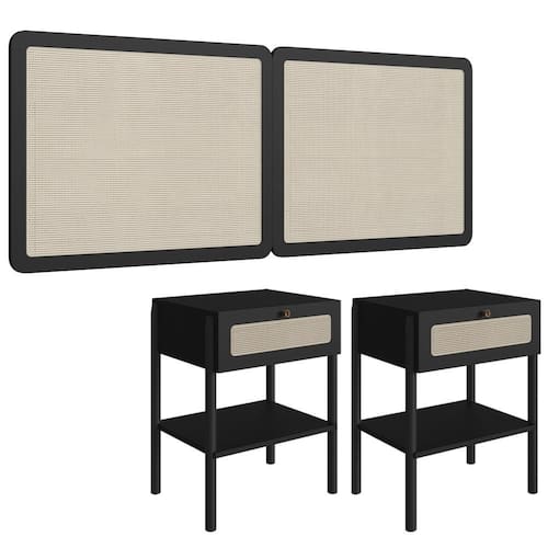 Cabeceira e 2 Mesas de Cabeceira 27977, o conjunto ideal para deixar seu quarto mais elegante. Produzido em madeira maciça Eucalipto e MDP 15 mm com acabamento BP. As mesas possuem gavetas com corrediças metálicas, puxadores em poliestireno dourado e detalhes em tela sintética (PVC) imitando palhinha, presentes também na cabeceira. Conta ainda com sapatas emborrachadas que evitam atrito com o piso. Atende aos padrões Casal e Queen Size. Produto entregue em 5 volumes.