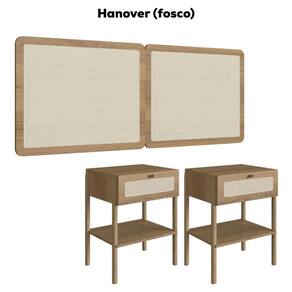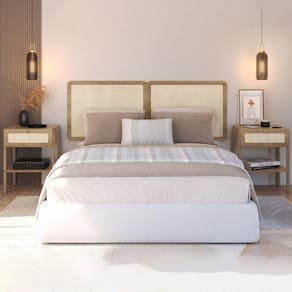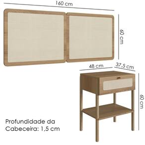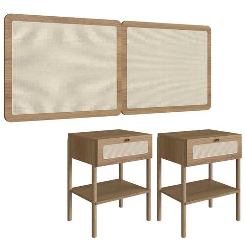 Cabeceira e 2 Mesas de Cabeceira 27977, o conjunto ideal para deixar seu quarto mais elegante. Produzido em madeira maciça Eucalipto e MDP 15 mm com acabamento BP. As mesas possuem gavetas com corrediças metálicas, puxadores em poliestireno dourado e detalhes em tela sintética (PVC) imitando palhinha, presentes também na cabeceira. Conta ainda com sapatas emborrachadas que evitam atrito com o piso. Atende aos padrões Casal e Queen Size. Produto entregue em 5 volumes.