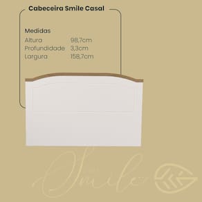 Marca: SERPIL MÓVEIS Linha: Smile Cor: Off White/Carvalho Material: MDF – Aplique em madeira maciça Conteúdo da embalagem: 1 Cabeceira Smile Casal 158cm Medidas do produto Montado: A. 98,7 cm x L. 158,7 cm P. 3,3 cm Volume 01: A. 35 cm x L. 99,5 cm P. 165,0 cm Peso total aproximado da embalagem: 17 kg