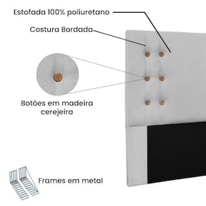 Revestimento em linho: tecido resistente, confortável e com visual sofisticado.Botões em madeira cerejeira: detalhe exclusivo que realça o charme do acabamento.Costura bordada: acabamento impecável e visual refinado.Estrutura reforçada: espuma de qualidade + madeira industrializada.Acompanha frames em metal: fixação segura e prática no box.Conforto e estilo em um único produto: perfeito para qualquer ambiente.