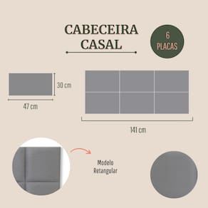 CONFIRA ABAIXO MAIS DETALHES SOBRE O PRODUTO: Tamanho Casal (6 placas): 141 cm (comprimento total) x 60cm (altura) x 3 cm (profundidade). Altura de cada placa: 30 cm Largura de cada placa: 47cm Materiais: 100% MDF; Espuma; Fita 3M; Cores e Tecidos: temos 25 variações de cores e tecidos. Escolha a que você mais gosta.