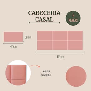 CONFIRA ABAIXO MAIS DETALHES SOBRE O PRODUTO: Tamanho Casal (6 placas): 141 cm (comprimento total) x 60cm (altura) x 3 cm (profundidade). Altura de cada placa: 30 cm Largura de cada placa: 47cm Materiais: 100% MDF; Espuma; Fita 3M; Cores e Tecidos: temos 25 variações de cores e tecidos. Escolha a que você mais gosta.