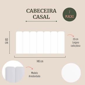 CONFIRA ABAIXO MAIS DETALHES SOBRE O PRODUTO: Tamanho Casal (7 placas): 140cm (comprimento total) x 60cm (altura) x 3 cm (profundidade). Altura de cada placa: 60 cm Largura de cada placa: 20cm Materiais: 100% MDF; Espuma; Fita 3M; Cores e Tecidos: temos 25 variações de cores e tecidos. Escolha a que você mais gosta.