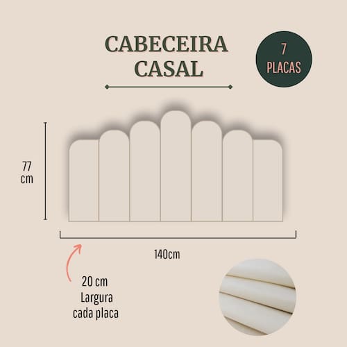Tamanho casal (7 placas): 140cm (comprimento total) x 77cm (altura) x 3 cm (profundidade).