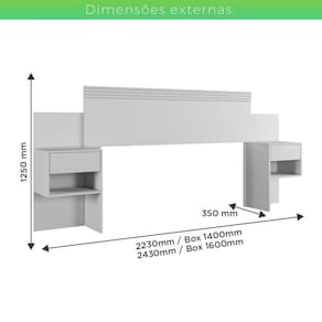 A Cabeceira Master é um móvel robusto e elegante, produzido inteiramente em chapa de 15 mm, garantindo durabilidade e resistência. Com duas mesas de cabeceira integradas, proporciona praticidade e funcionalidade ao ambiente. Além disso, conta com duas gavetas espaçosas, equipadas com corrediças telescópicas, oferecendo amplo espaço para armazenamento. Sua montagem dupla permite a adaptação a colchões de 140 cm e 160 cm, proporcionando versatilidade para diferentes tamanhos de cama. O melhor de tudo é que não necessita ser parafusada na parede, conferindo flexibilidade na disposição do ambiente. Produto Montado: Sim Acabamento da Mesa de Cabeceira: Pintura Ambiente Principal: Quarto Cabeceira Estofada: Não codigo_ean: 7909903492291 Complexidade da Montagem: Média: pode ser montado por mais de uma pessoa e/ou necessite de maior conhecimento para montagem Cor: Branco Cor do Produto: Branco Escala de Brilho: Fosco Escala de Brilho da Mesa de Cabeceira: Fosco Extensível: Sim Fixação Box: Não Fixação na Parede: Não Itens Inclusos: 1 Cabeceira, Kit Ferragens e Manual de Montagem Largura Máxima: 243 cm Largura Mínima: 223 cm Linha ou Coleção: Master Manual de Montagem e Instalação: https://product-hub-prd.madeiramadeira.com.br/880646/documents/1b48e3c2-14a9-4eea-8f80-647f30356bb17556benetilferragemtamreal.pdf Material da Mesa de Cabeceira: MDF/MDP Material Principal: MDF/MDP Necessita Montagem: Sim Origem do Produto: Nacional Peso: 37,9 kg Possui Baú: Não Possui Mesa de Cabeceira: 02 Possui Pés: Não Possui Vidro: Não Recomendações de Uso, Manutenção e Limpeza: Limpeza com pano macio e levemente umedecido. Não utilizar solventes a base e de inflamáveis. Não utilizar produtos abrasivos. Sistema de Montagem: PARAFUSOS E CAVILHAS Tipo de Colchão: Casal