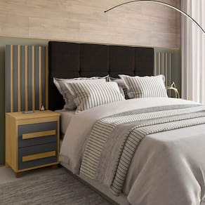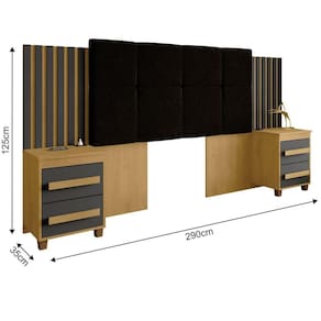Cabeceira Casal Extensível Com 2 Mesas De Apoio Ripado E Estofado Cinamomo Com Grafite Suíça - Rv Móveis Transforme o ambiente do seu quarto com a elegante Cabeceira Extensível Suíça! Seu design contemporâneo e detalhes ripados conferem um toque de estilo refinado, perfeitamente integrado a qualquer decoração. Esta cabeceira é versátil, adaptando-se a diferentes tamanhos de box, como 1,38m, 1,58m, 1,88m e 1,98m oferecendo praticidade com suas duas mesas de cabeceira e 4 gavetas para armazenamento organizado. Os pés em PVC garantem estabilidade sem danificar o piso, enquanto os materiais de alta qualidade asseguram durabilidade e resistência ao longo do tempo. Dimensões do Produto Montado:Altura: 125 cmLargura: 290 cmProfundidade: 35 cmObservações:- Adaptável para box de 1,38, 1,58, 1,88 e 1,98m;- com Corrediças telescópicas;- Ripas Autênticas- Puxadores em MDF;- 2 Tomadas inclusas;