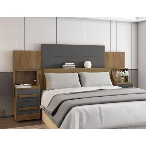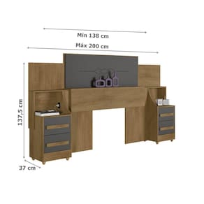A cabeceira Síria foi desenvolvido para ser adaptável a box de 1,40 m 1,60 m 1,90 m 2,00 m, possui 02 mesas de cabeceira com 02 gavetas com corrediça telescópica 02 tomadas e 08 pés sendo o produto ideal para aproveitamento de espaço no quarto. Produto Montado: Sim Acabamento da Mesa de Cabeceira: Pintura Acabamento dos Pés: Pintura Altura dos Pés: 6 cm Altura Máxima dos Pés: 6.0000 Ambiente Principal: Quarto Cabeceira Estofada: Não codigo_ean: 7909903331705 Complexidade da Montagem: Média: pode ser montado por mais de uma pessoa e/ou necessite de maior conhecimento para montagem Cor: Cinamomo/Grafite Cor do Produto: Cinamomo/Grafite Cor Flex: Sim (Encosto) Escala de Brilho: Fosco Escala de Brilho da Mesa de Cabeceira: Fosco Extensível: Sim Fixação Box: Não Fixação na Parede: Não Informações Complementares: Seguir as orientações do manual de uso e montagem. Itens Inclusos: 1 Cabeceira, kit ferragens e manual de montagem Largura Máxima: 200 cm Largura Mínima: 138 cm Linha ou Coleção: Síria Manual de Montagem e Instalação: https://product-hub-prd.madeiramadeira.com.br/852639/documents/a1b1fb96-8c9a-452d-841e-c61014df1c2aiaatualizadomanualmontagem.pdf Material da Mesa de Cabeceira: MDF/MDP Material dos Pés: Polipropileno Material Principal: MDF/MDP Montagem Flex: Sim (Tamanho do Colchão) Necessita Montagem: Sim Origem do Produto: Nacional Peso: 50 kg Possui Baú: Não Possui Mesa de Cabeceira: 02 Possui Pés: 08 Possui Rodízio: Não Possui Possui Vidro: Não Recomendações de Uso, Manutenção e Limpeza: Limpar com pano úmido sem produtos químicos e manter ao abrigo de sol e agua Sapatas Niveladoras: Não Sistema de Montagem: Parafuso Minifix Cavilha Tipo de Colchão: Casal/Queen/King Ean: 7909903331705