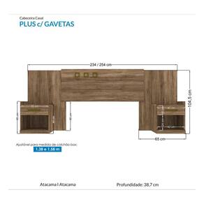 Este produto é de fácil montagem, além de muito prático e bonito. Ele possui 02 gavetas (uma de cada lado) que deslizam sobre corrediças metálicas, onde é possível apoiar pequenos objetos, livros, celulares, etc. Sua estrutura em 12 e 15 mm está projetada para ser utilizada com colchões de casal box de 1,38 à 1,58 m de largura, pois essa cabeceira possui um sistema de montagem que se ajusta às duas medidas de colchões. Detalhes na cabeceira e puxadores em ABS dão um charme todo especial ao produto. Produto Montado: Sim Acabamento da Mesa de Cabeceira: Pintura Ambiente: Quarto Ambiente Principal: Quarto Cabeceira Estofada: Não codigo_ean: 7896659471802 Complexidade da Montagem: Baixa: pode ser montado por uma pessoa sozinha Cor: Atacama Cor: Atacama Cor do Produto: Atacama Cor Flex: não Escala de Brilho: Semi-Brilho Escala de Brilho da Mesa de Cabeceira: Semi-Brilho Extensível: Sim Fixação Box: Não Fixação na Parede: Não Itens Inclusos: 1 Cabeceira, Kit Ferragens e Manual de Montagem Largura do Colchão Indicado: 138cm/158cm Largura Máxima: 254 cm Largura Mínima: 234 cm Linha ou Coleção: Plus Manual de Montagem e Instalação: https://product-hub-prd.madeiramadeira.com.br/370244/documents/23180f5b-31d2-4c98-a942-97541a409d2b9694904311cabcasalpluscgav.pdf Material da Mesa de Cabeceira: MDP Material Principal: MDP Montagem Flex: sim Necessita Montagem: Sim Origem do Produto: Nacional Peso: 36,2 kg Possui Baú: Não Possui Espelho: Não Possui Possui Mesa de Cabeceira: 02 Possui Pés: Não Possui Vidro: Não Recomendações de Uso, Manutenção e Limpeza: Não limpar com álcool ou qualquer outro produto químico. Utilize somente pano seco ou levemente umedecido. Sistema de Montagem: Parafusos, Cavilhas e Girofix. Tipo de Colchão: Casal
