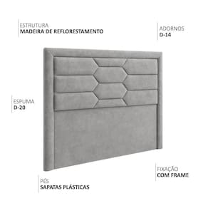 Cabeceira Casal King Cama Box 195 Cm Roma Veludo Cinza - Nexta Casa Cabeceira Roma Essa cabeceira de casal foi feita para durar e impressionar. Ela acolhe, harmoniza e eleva o estilo do ambiente sem esforço!Descrição do Produto Mais que uma cabeceira, um upgrade na decoração do seu quarto. Com estrutura sólida em madeira e espuma de alta densidade, ela une beleza e durabilidade. O visual reto e elegante se adapta a diversos estilos, do moderno ao clássico. Fácil de combinar, cria uma composição harmoniosa e acrescenta conforto e sofisticação ao ambiente. Transforme seu quarto em um verdadeiro refúgio de estilo com a Cabeceira Roma. Sua cama merece um cenário à altura dos seus sonhos! Características Técnicas Estrutura: Madeira de reflorestamento (pinus, eucaliptos e placas de MDF) com imunização contra mofo, cupim e micro-organismos. Material do Enchimento: D-20. Revestimento: Veludo Pés: Sapatas plásticas. Possui Frame: Sim. É adequado para cama box: sim. Medidas Altura Total: 141 cm Largura: 215 cm Profundidade: 13 cm Peso: 28,3 kg Diferenciais Design reto e clean. com Cama Box. Ideal para colchão de casal 195cm. Parte traseira revestida em Kami. Quantidade de Volumes: 1. Não necessita de montagem, apenas a fixação do frame! Cuidados Utilizar um pano levemente umedecido com água, seguido de pano seco. Evitar exposição ao sol para preservar a cor vibrante do tecido. Não usar produtos abrasivos ou escovas. Garantia 3 meses contra de fabricação. Observações A tonalidade da cor pode variar de acordo com o lote do fabricante. Imagens ilustrativas; tonalidade pode variar devido à configuração de cores da tela. Objetos de decoração não inclusos. Produtos enviados embalados com , reduzindo riscos de danos. Verificar as condições da embalagem na e reportar danos no . até a porta de entrada ou portaria. Confirme as dimensões e compatibilidade do de instalação. Não nos responsabilizamos por montagem, desmontagem, instalação ou por escadas/elevadores. Marca: Não Informado