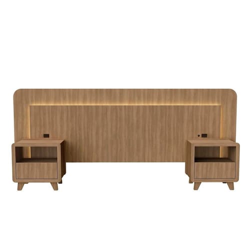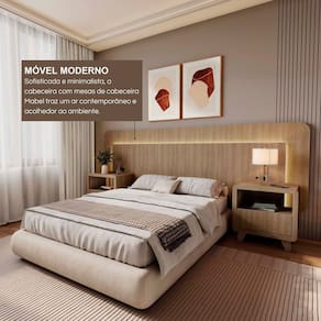 A Cabeceira Mabel Casal/Queen leva para o seu quarto o mesmo padrão de qualidade dos móveis planejados, unindo beleza, resistência e funcionalidade. Produzida em 100% MDF com revestimento BP e acabamento em fita de borda PVC 0,045cm, garante durabilidade e sofisticação, com acabamento superior típico de móveis planejados de alto padrão. O conjunto acompanha 2 mesas de cabeceira com gaveta e nicho, ideais para organizar livros, objetos e apoiar luminárias. Para o dia a dia, conta com duas tomadas embutidas (uma de cada lado), perfeitas para carregar eletrônicos. O diferencial está na fita de LED 3000K, que cria iluminação indireta aconchegante, deixando o quarto moderno e confortável. Indicada para camas de até 158 cm (Casal ou Queen), combina com móveis amadeirados, brancos ou cinza. Produto Montado: Sim Acabamento da Mesa de Cabeceira: Melamínico Altura dos Pés: 11,5 cm Altura Máxima dos Pés: 11.5000 Ambiente Principal: Quarto Cabeceira Estofada: Não codigo_ean: 7901008600946 Complexidade da Montagem: Média: pode ser montado por mais de uma pessoa e/ou necessite de maior conhecimento para montagem Cor: Louro Freijó Grann Cor do Produto: Louro Freijó Grann Cor Flex: Não Escala de Brilho: Fosco Escala de Brilho da Mesa de Cabeceira: Fosco Extensível: Não Fixação Box: Não Fixação na Parede: Sim Informações Complementares: Limpar somente com um pano levemente umedecido. Indicado para ambientes internos. Itens Inclusos: 1 Cabeceira, 2 Mesas de Cabeceira, Kit Ferragens e Manual de Montagem Largura do Colchão Indicado: 138cm/158cm Linha ou Coleção: Mabel Manual de Montagem e Instalação: https://product-hub-prd.madeiramadeira.com.br/402273039/documents/2b20e91b-9d01-471a-856c-d762c98d00ac3143954657817555228378289.pdf Marca: FD Material da Mesa de Cabeceira: MDF Material dos Pés: MDF Material Principal: MDF Montagem Flex: Não Necessita Montagem: Sim Origem do Produto: Nacional Peso: 67 kg Possui Baú: Não Possui Espelho: Não Possui Mesa de Cabeceira: 02 Possui Pés: 08 Possui Rodízio: Não Possui Possui Vidro: Não Recomendações de Uso, Manutenção e Limpeza: Limpar somente com um pano levemente umedecido. Indicado para ambientes internos Sistema de Montagem: Parafusos, cavilhas e minifix Tipo de Colchão: Casal/Queen