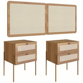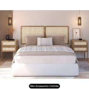 Características do Produto Material da estrutura: MDP 15mm/HDF 3mm. Peso Suportado: 11 Kg distribuídos. Acabamento: BP. Escala de Brilho: Fosco. Possui Pés: Sim. Material dos Pés: Aço metálico. Possui Gaveta: Sim. Quantidade de Gavetas: 4 Gavetas. Tipo de Corrediças: Metálicas. Possui Puxador: Sim. Material do Puxador: Poliestireno. Possui Nicho: não. Possui Porta: Não. Possui Prateleira: Sim. Diferenciais: - Design retrô. - Detalhes de tela sintética. - Intalacão da cabeceira facilitada com suporte metálico. - Cabeceira painel. - Cantos arredondados. - Indicada para colchão queen. Sistema de Montagem: Minifix/Cavilhas/Parafusos. Manual de Montagem: Sim. Complexidade da Montagem: Média. Conteúdo da Embalagem: 1 Cabeceira/ 2 Mesas de Cabeceiras. Volumes: 5 Volumes. Garantia do Fabricante: 90 dias contra defeitos de fabricação. Montagem: Recomendamos que seja feita por um profissional. Recomendação de limpeza: Utilize pano levemente úmido.