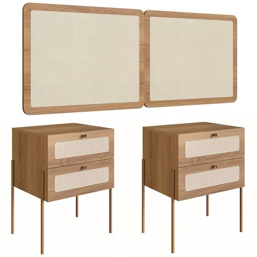 Fabricada em MDP com acabamento BP e detalhes em tela sintética, a Cabeceira Quenn oferece durabilidade e um toque acolhedor ao quarto. O design retrô sofisticado harmoniza perfeitamente com diversos estilos, enquanto os suportes metálicos garantem uma instalação firme e discreta. Já as Mesas de Cabeceira são ideais para manter o quarto organizado. Com duas gavetas espaçosas equipadas com corrediças metálicas e puxadores de poliestireno, oferece espaço extra para itens pessoais. Feita em MDP 15 mm e pés metálicos com acabamento epóxi, a mesa combina resistência e sofisticação no Quarto de Casal.