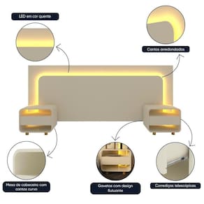 A cabeceira Innova é o móvel ideal para transformar a decoração do seu quarto. Com design curvo e LED em cor quente, traz um tom de aconchego, tranquilidade e modernidade ao seu ambiente de descanso. Possui duas mesas de cabeceira com gavetas de design flutuante e cantos arredondados. O grande destaque é a possibilidade de organizar as peças de acordo com o tamanho da sua cama, dessa forma atendendo padrões casal (140cm), queen (160cm) e king (195cm).