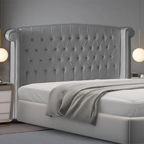 Essa cabeceira casal estofada é um luxo só, isso porque o seu design curvo somado aos botões revestidos cria um ambiente clássico e charmoso.